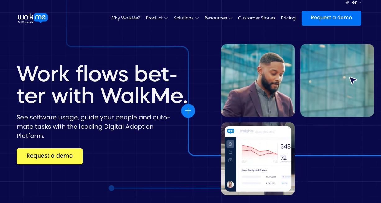 Consider two competitors in the digital adoption platform space: WalkMe and Apty. WalkMe's homepage focuses on the mechanism: "Work flows better with WalkMe. See software usage, guide your people and automate tasks with the leading Digital Adoption Platform."